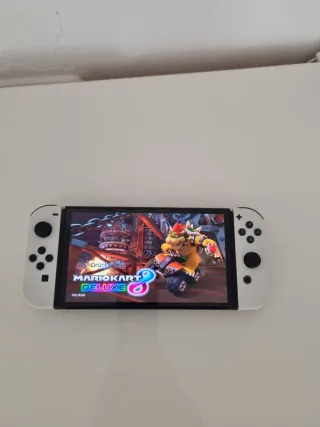 Consola Nintendo Switch OLED en color blanco. Se encuentra en muy buen estado. Todos los componentes de la consola, cables, mandos, pantalla, se encuentran en perfecto estado. La caja está en perfecto estado con los embalajes originales. - Incluye la consola. - Dock para carga y conexión. - Joy-Con (L) y Joy-Con (R). - Juego The Legend of Zelda: Breath of the Wild. - Juego Moving Out 2 - Cargador. - HDMI.