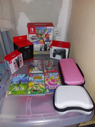 Consola Nintendo Switch modelo OLED. Semi-nueva pero conservada muy bien, en perfectas condiciones. Incluye: - 4 Joycons (2 Blancos y 2 Rosas) - Mando Pro de Nintendo - Funda para guardar mando pro - Todos sus accesorios (Base, cableado, mando-conector para los Joycons, también para los de 1 mano). - 6 Juegos (Smash Bros Ultímate, Mario Odysey, Princess Showtime, Animal Crossing New Horizones y The Legend Of Zelda: Breath Of The Wild) - Funda para guardar la consola, color rosa. - Cargador extra para los mandos Joycon. - 1 año de suscripción para Nintendo Online (Todavía no canjeado) Precio poco negociable. No viene Super Mario W