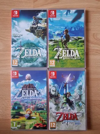 Conjunto de 4 carátulas originales para juegos de Nintendo Switch de la saga The Legend of Zelda. - The Legend of Zelda: Tears of the Kingdom - The Legend of Zelda: Breath of the Wild - The Legend of Zelda: Link's Awakening - The Legend of Zelda: Skyward Sword HD No incluyen el juego. Cada una 7€. Todas juntas 25€.