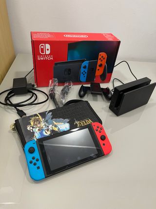 - Incluye consola. - Mandos Joy-Con (izquierdo verde, derecho rosa). - Base de carga. - Cargador original Nintendo. - Cable HDMI original. - Grip para unir mandos cuando está en TV. - Correas sin usar. - Manual. - Va incluida tarjeta SD de 256 GB. - Protector de pantalla ya instalado. - La caja es de OLED pero la consola es de las primeras. - Funciona a la perfección, tanto mandos, como consola y accesorios. - Se incluyen los juegos de las fotos y algunos más de Mario y Zelda. - Precio 250, no negociable, trato en mano. - Cualquier duda, preguntar sin compromiso. Un saludo.