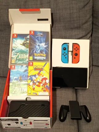 Consola Nintendo Switch OLED con accesorios y tres videojuegos. - Incluye los juegos: The Legend of Zelda: Tears of the Kingdom, The legend of Zelda: Breath of the Wild, Pokémon Diamante Brillante y Sonic Mania. - Joy-Cons en color azul y rojo. - Dock para carga y conexión a TV.