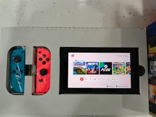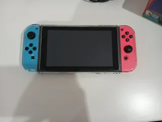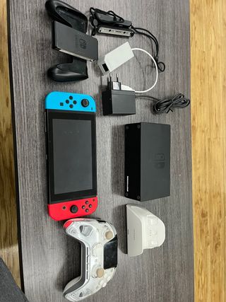 Consola Nintendo Switch con Joy-Cons en azul y rojo. Incluye todos los accesorios necesarios para empezar a jugar. - Adaptador de corriente. - Base de conexión (dock). - Mando Pro transparente e inalambrico con base de carga - Tarjeta de memoria 128gb - Negociable