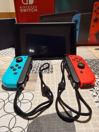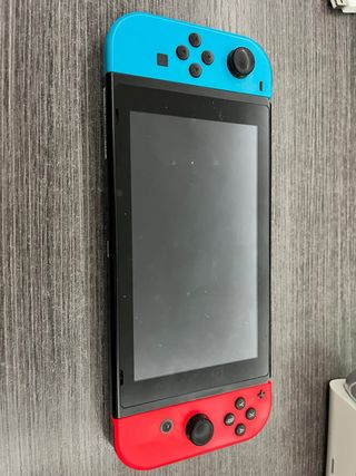 Precio NO negociable. Consola Nintendo Switch en buen estado y perfecto funcionamiento. - Color azul y rojo. - Incluye cargador, base de carga, soporte para mandos, cable HDMI, funda para usarla en modo portátil y correas para Joy-Con. - Pantalla protegida con protector incluido.