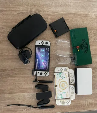 Consola Nintendo Switch con un diseño inspirado en The Legend of Zelda. - Incluye Joy-Con blancos. - Estuche de transporte negro. - Base de carga. - Cargador de corriente. - Correa para Joy-Con.