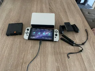 Consola Nintendo Switch OLED en color blanco, con accesorios adicionales. - Funda de transporte con diseño degradado. - Base de carga para Joy-Con. - Correas para Joy-Con. - Protector de pantalla. - 2 juegos