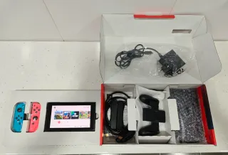 Consola Nintendo Switch con varios accesorios para ampliar tu experiencia de juego. - Incluye base de carga. - 4 mandos Joy Con. El segundo juego de mandos no encienden las luces interiores peto funcionan todas los botones sin problema. - 4 Correas para Joy-Con. - 2 adaptadores mandos Joy Con - Base de carga para 4 mandos Joy Con y ranuras para poner juegos - Cargador de corriente. - Cable hdmi para conexión TV Restaurado a valores de fábrica, sin tarjeta de memoria.