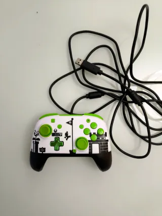 Mando con cable para Nintendo Switch, con un diseño inspirado en Mario Bros. - Diseño blanco con detalles verdes y negros. - Ilustraciones de elementos clásicos de Mario Bros. - Cable de 3-4 m