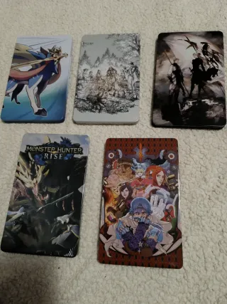 Conjunto de cinco cajas metálicas para Nintendo Switch con diseños de videojuegos. - Caja con diseño de Pokémon Espada - Caja con arte de Octopath Travellers II - Caja con arte de Tactics Ogre - Caja con diseño de Monster Hunter Rise. - Caja con arte de Baten Kaitos