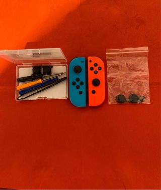 Joycons para Nintendo Switch en colores azul y naranja. Incluye kit de herramientas y repuestos. - Joycon izquierdo azul. - Joycon derecho naranja. - Kit de destornilladores y palancas. - Dos tapas para joystick.