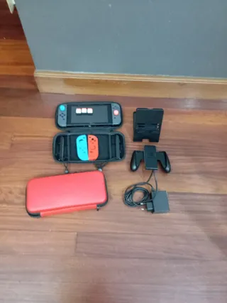 Consola Nintendo Switch con varios accesorios para ampliar tu experiencia de juego. - Incluye consola. - Mandos Joy-Con. - Base de carga para Joy-Con. - Agarre para mandos. - Soporte. - Cargador. - Funda de transporte roja.