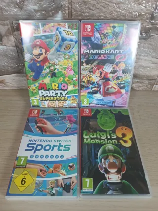 Lote de cuatro videojuegos para Nintendo Switch en muy buen estado funcionando correctamente ✅. El precio es por el lote completo, no se vende por separado, 120€ y de regalo el pack de accesorios para la Nintendo swtich sports. EL PRECIO NO ES NEGOCIABLE, gracias. - Mario Kart 8 Deluxe - Luigi's Mansion 3 - Nintendo Switch Sports - Mario Party Superstars Doy de garantía la calidad de mis reseñas, más de 500 valoraciones, 5 estrellas