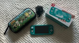 Consola Nintendo Switch Lite en color verde, con funda temática de Animal Crossing y su caja original. - Funda con diseño de Animal Crossing. - Incluye caja original. - Incluye cargador original.