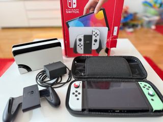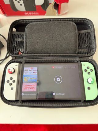 Consola Nintendo Switch OLED en blanco y verde, con todos sus accesorios originales. - Base de carga blanca. - Joy-Con (L) verde y (R) blanco. - Cargador de corriente. - Soporte para Joy-Con. - Estuche de transporte. - Protectores. En perfecto estado. Se vende por cambio de consola.