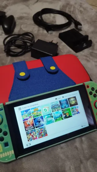 Consola Nintendo Switch liberada con juegos digitales como: * Animal Crossing: New Horizons * Luigi's Mansion 3 * Pokémon Leyendas: Arceus * Mario Kart 8 Deluxe * Super Mario Odyssey * Super Mario Wonder * Little nightmares * Zelda: Breath of the Wild y Tests of Kingdom * Hollow Knight Y más También Incluye: - Protector de Animal Crossing - Funda de Mario Bros - Cable HDMI - Cargador - Base de carga (no original) - Cristal templado extra para pantalla - Mando para los Joy-Cons - Tarjeta micro SD El botón abajo del Joy-Cons rara vez se traba, pero se puede jugar con total normalidad ❗ Envíos disponibles 📦