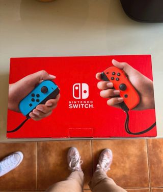 Consola Nintendo Switch en colores azul y rojo neón, sin estrenar. La caja está sin abrir. La vendemos porque se la regalaron a mi hijo por Reyes y ya la tiene. No podemos cambiarla porque no tenemos el ticket de compra.