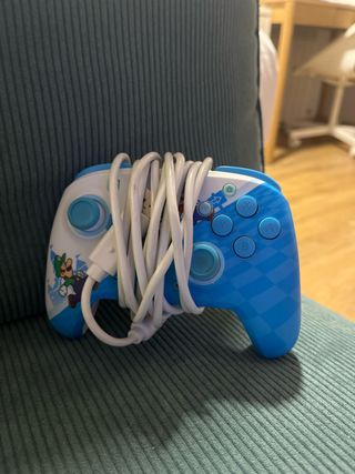 Mando de Nintendo Switch con un diseño inspirado en Mario y Luigi. El cable está enrollado. - Diseño azul y blanco. - Ilustraciones de Mario y Luigi.