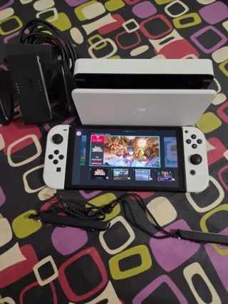 Consola Nintendo Switch modelo OLED en color blanco. Incluye todos sus accesorios originales. - Pantalla OLED de 7 pulgadas. - Base de carga. - Joy-Con blancos. - Correa para Joy-Con.