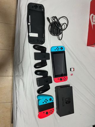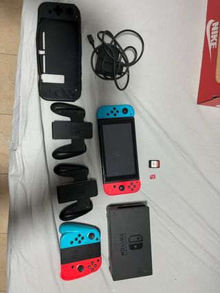 Consola Nintendo Switch con sus accesorios. - Incluye Joy-Con en azul y rojo. - Base de carga para Joy-Con. - Funda protectora negra. - Cable de carga. - Dock para la consola. - Tarjetas de memoria.