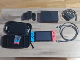 Consola Nintendo Switch con accesorios y funda para viaje, donde caben todos sus accesorios y tambien tiene sitio para extra y joy cons extras, cargador de tajetas de juegos, etc. La consola tiene puesto protector de pantalla. - Incluye Joy-Con azules y rojos. - Base de carga. - Cargador de corriente. - Agarre para Joy-Con. - Tarjeta de memoria nintendo de 128GB - Cable HDMI