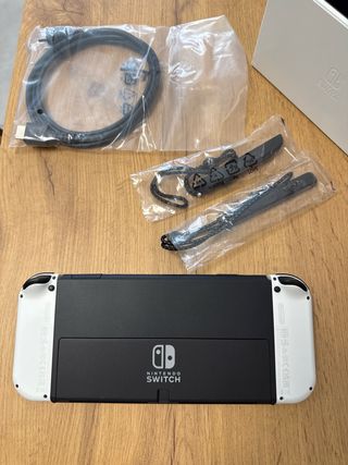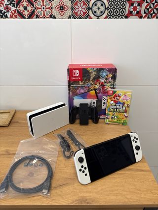 Consola Nintendo Switch OLED en color blanco, con el juego Mario Kart 8 Deluxe. - Incluye base de carga. - Mandos Joy-Con. - Cables de conexión.