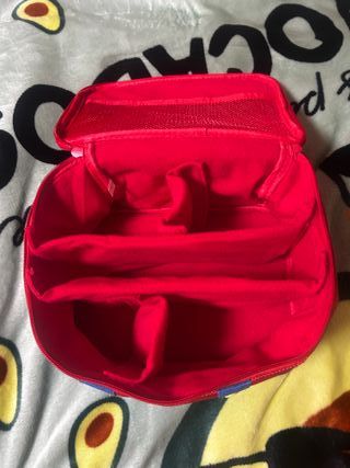 Funda de transporte con un diseño inspirado en Super Mario. - Parte superior rígida de color rojo. - Parte inferior y detalles en tela azul. - Cierres amarillos. - Asa de transporte. - Espacios para todos los accesorios de la consola, incluidas ranuras para varios juegos. - Medidas: 32x26x11 cm.