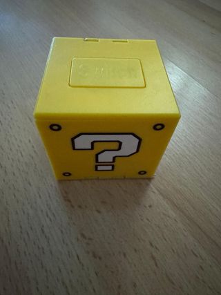 Cubo de juegos con diseño inspirado en los bloques de Mario Bros. - Color amarillo brillante. - Detalle de signo de interrogación. - Almacenamiento para 16 cartuchos de Nintendo Switch