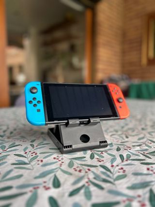 Soporte de carga ajustable para Nintendo Switch. Permite cargar la consola mientras se usa. - Diseño plegable y portátil. - Conexión USB-C para carga. - Ángulo ajustable para visualización cómoda.