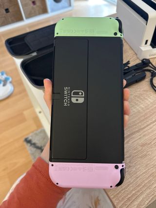 Consola Nintendo Switch OLED en perfecto estado. No aparece en las fotos pero viene con caja original. - Incluye funda protectora. - Joy-Cons en colores rosa y verde+ 2 blancos. Todos son originales, con su respectiva caja. - Base de carga para todos los mandos.