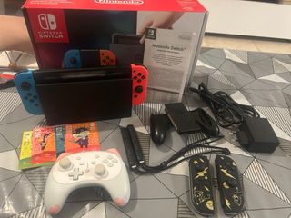 Consola Nintendo Switch con todos sus accesorios originales. - Incluye Joy-Cons azul y rojo. - Dock para TV. - Cargador y cables. - Agarre para Joy-Cons. - Tarjetas de Animal Crossing. - Mando Pro personalizado. - Dos pares de mandos Joy, los azul y rojo y los de pokemon - caja como nueva original