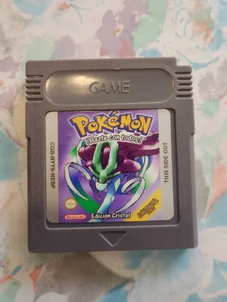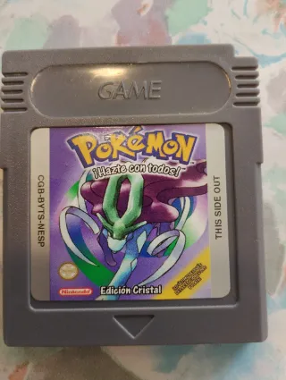 Cartucho de juego Pokémon Edición Cristal para Game Boy Color. ¡Hazte con todos! - Cartucho gris. - Etiqueta con diseño de Pokémon. - Texto Edición Cristal visible.