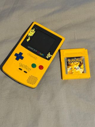 Consola portátil Game Boy Color edición especial Pikachu, junto con el juego Pokémon Amarillo. - Incluye consola y cartucho de juego. - Diseño temático de Pokémon. La tapa de las pilas corresponde a una GB color amarilla que tenía y como el color coincide me gustó más en esta combinación.