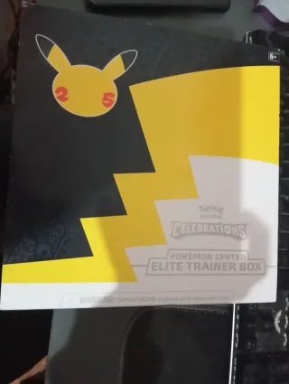 Se vende 2 CAJAS VACIAS de la colección Pokémon 25 ANIVERSARIO Celebrations, edición especial Pokémon Center Elite Trainer Box. - Diseño con Pikachu y temática de rayo. - Incluye el juego completo de fundas DADOS-MONEDA e energías Se puede negociar cada una 35€