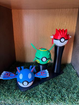 Set de figuras coleccionables de Pokeballs inspiradas en Pokémon legendarios. - Figura de Kyogre en color azul. - Figura de Rayquaza en color verde. - Figura de Groudon en color rojo.