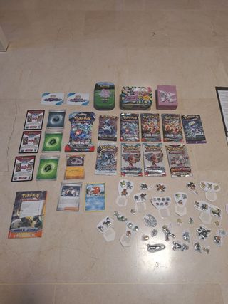 Gran lote de pokémon juego de cartas coleccionables de hace ya algunos años. El lote incluye: • 3 códigos de cartas online sin canjear. • 3 cartas repetidas y 3 energias. COMPLETAMENTE ORIGINALES • Sobres de cartas ABIERTOS. EL SOBRE DE PLATINO Y EL DE FRONTERAS CRUZADAS ESTÁN VENDIDOS. • 2 panfletos de Brecha Paradojica y el libro de reglas de diamante y perla (está recortada la portada pero el resto está bien). • Numerosas pegatinas de Negro y Blanco. • Tapete para jugar a pokémon JCC. • Lata metálica de pokémon GO, Lata (falsa) de Golpe Fusión y caja de diamante y perla del BK (ES