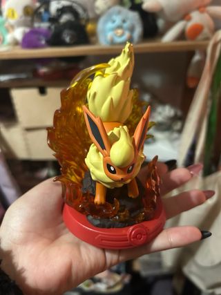 Figura coleccionable del Pokémon Flareon, con detalles de fuego. - Base roja con diseño de Poké Ball. - Figura de PVC con acabado brillante. perfecto estado a excepción de un lado de la caja al abrirlo se vende porque lo tengo repetido