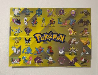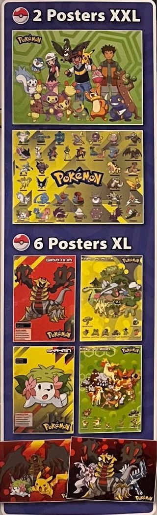8 Posters originales de la aclamada saga “Pokemon”, lanzados en el año 2009. Consta de 1 lámina A1 a doble cara que conforman 2 Posters XXL con unas dimensiones aproximadas de 59cm de alto por 82cm de ancho, y 3 láminas A2 a doble cara que conforman 6 Posters XL con unas dimensiones aproximadas de 42cm por 59cm. Como se puede apreciar en las fotos del anuncio los pósteres se encuentra en buenas condiciones de estado, nunca antes manipulados.