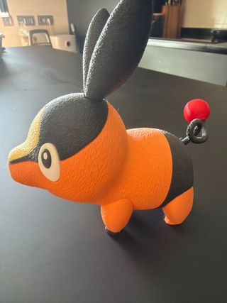 Figura impresa en 3D de un personaje Pokémon. - Material: PLA. - Colores: Naranja y negro con detalles rojos.