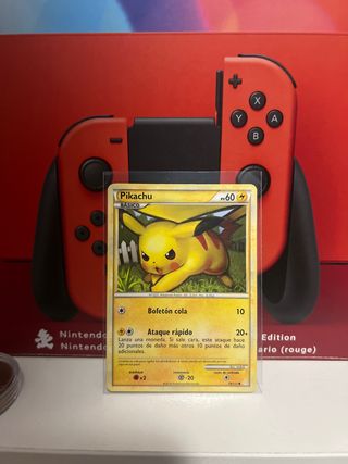 Carta coleccionable de Pikachu, edición básica. - Ataque: Bofetón cola - Ataque rápido: Lanza una moneda. Si sale cara, este ataque hace 20 puntos de daño más otros 10 puntos de daño adicionales. - Debilidad: x2 - Resistencia: -20