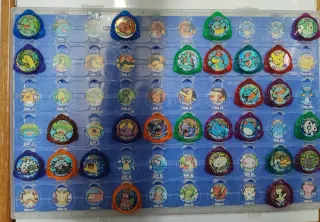 Colección de Kraks de Pokémon, algunos con brillos. - Kraks con diferentes personajes de Pokémon. - Algunos Kraks muestran el número de serie. - La colección está incompleta.