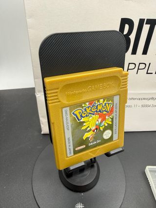 Cartucho de juego Pokémon Gold Version para Game Boy. - Cartucho dorado brillante. - Etiqueta con arte de Ho-Oh. - Clasificación E (Everyone).