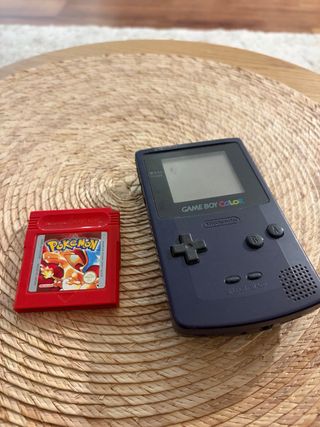 Consola portátil Game Boy Color en color azul marino, junto con el cartucho del juego Pokémon Rojo. - Incluye cartucho de Pokémon Rojo.