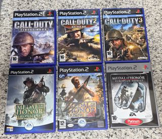 Lote de videojuegos para PlayStation 2, PlayStation 3 y PlayStation 4. Lotes a negociar PS4 - Call of Duty: WWII 15 euros - Call of Duty: Vanguard 15 euros - Lego: Vengadores 7 euros - Need for Speed, Hot Pursuit. 15 euros PS3 - Battlefield 3: Limited Edition 10 euros - Call of duty: world at war 15 euros PS2 - Call of Duty: Finest Hour 10 euros - Call of Duty 2: Big Red One 10 euros - Call of Duty 3 8 euros -Medal of Honor frontline 10 euros -Medal of Honor rising sun 10 -Medal of Honor european assault 10 euros