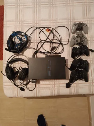 Consola Playstation 2 en color negro, lista para horas de diversión, muchísimos juegos - Incluye 5 mandos. - Dos auriculares. - Cables de conexión.