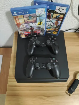 Consola PlayStation 4 Slim 500gb en color negro, con dos mando DualShock 4 y dos videojuegos. - Incluye los juegos The Crew 2 y Grand Theft Auto V. - Mando inalámbrico DualShock 4. -HDMI Cambio por cosa que me interese