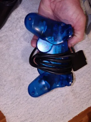 Mando Dualshock para PlayStation 2 en color azul transparente. El cable está enrollado sobre el mando. - Diseño translúcido. - Botones de acción negros.