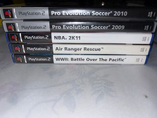 Lote de cinco videojuegos para PlayStation 2. - Pro Evolution Soccer 2010 - Pro Evolution Soccer 2009 - NBA 2K11 - Air Ranger Rescue - WWII: Battle Over The Pacific