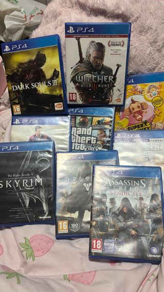 Lote de juegos para PlayStation 4 en buen estado. - Dark Souls III---13€ - The Witcher 3: Wild Hunt---10€ - Grand Theft Auto V---9€ - The Elder Scrolls V: Skyrim Special Edition---17€ - Destiny---3€ - Assassin's Creed Syndicate---8€ - Super Monkey Ball---10€ - Star Wars Battlefront---8€ -FIFA 15---3€ LOTE 75,99