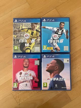 Pack de cuatro videojuegos de fútbol para PlayStation 4. Por separado: - FIFA 17(3€) - FIFA 19(3€) - FIFA 20(5€) - FIFA 22(5€)
