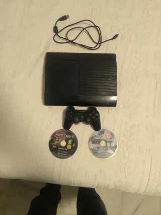 Consola PlayStation 3 en color negro, lista para disfrutar. - Incluye mando DualShock 3.( A veces falla en modo inalámbrico, conectado con el cable no falla). - Juegos: Minecraft y PES 2018. - Cable de alimentación y conexión USB.