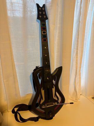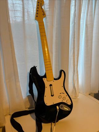 Guitarra para Rock Band, modelo Fender Stratocaster. La guitarra esteticamente esta perfecta. *No enciende y el departamento de las pilas esta sulfatado - No incluye receptor Usb - Color negro y blanco. - Incluye correa. - Compatible con PlayStation 3 Cualquier manitas seguro que la puede arreglarla